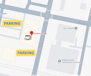 PARKING: There are TWO lots available for parking by Awaken Coffee tomorrow! Please see the map below for details.