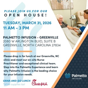 Their cutting-edge infusion centers offer the comforts and convenience of home with the support of an attentive care team. Patients can expect an open clinic setting and private rooms with soft chairs, clean blankets, Wi-Fi access, healthy snacks, and televisions – with plenty of smiles and support from the Palmetto team.